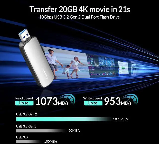 Speed: USB 3.2 Gen 2 thumb drive external hard drive up to 1073mb/s read speed and 953mb/s write speed, lightning-fast transfers for your files, 4K videos, and massive software in seconds, remains stable without lag.