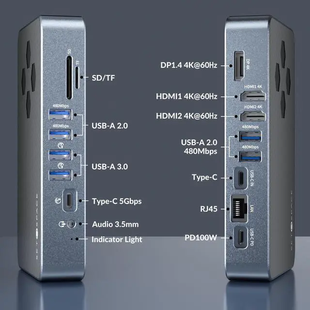 Transform your workspace with our USB C hub: 4 USB-A 2.0, 2 USB-A 3.0, 2 USB-C 3.0, dual 4K@60Hz HDMI, 4K DP, RJ45, 3.5mm Aux, SD/TF reader, and 100W PD in one sleek package. Expand your capabilities effortlessly.