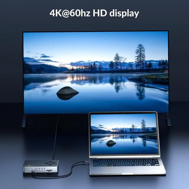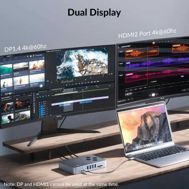 Enhance your display with the USB-C dock: dual 4K HDMI/DP outputs for vivid, high-definition visuals across multiple screens. Ideal for diverse projects or sharing content. Note: DP and the first HDMI port are not simultaneous.