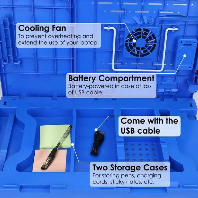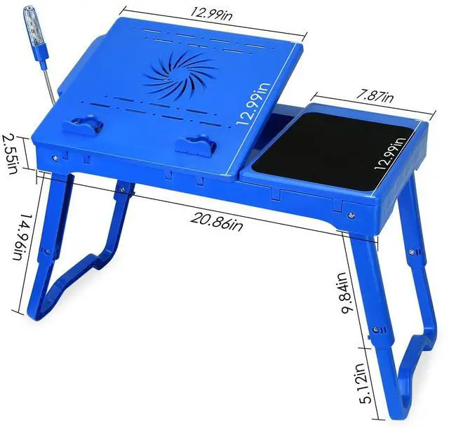 All in One Laptop DeskLaptop desk with fan keeps your computer cool. The flexible light is helpful if someone is sleeping while you are working in bed. You won't need the bedroom light on.Our laptop table feature mouse pad attacted, 4 USB ports and a pen storage.