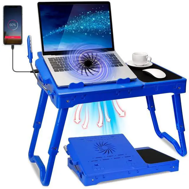 Laptop Desk for Bed, Laptop Bed Tray Table for Couch Sofa, Portable Adjustable Height Foldable Laptop Desk with Cooling Fan LED Light Mouse Pad 4 Port USB Hub (Blue)