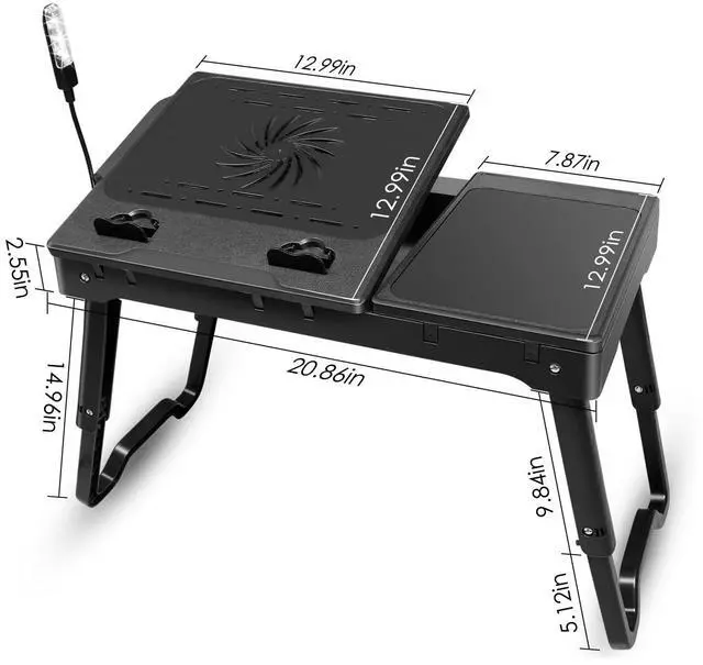 All in One Laptop DeskLaptop desk with fan keeps your computer cool. The flexible light is helpful if someone is sleeping while you are working in bed. You won't need the bedroom light on.Our laptop table feature mouse pad attacted, 4 USB ports and a pen storage.