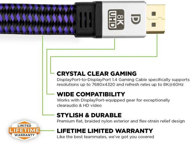 CRYSTAL CLEAR GAMING with DisplayPort 1.4 Cable that supports up to 32.4G bps bandwidth capable of 8K video with HDR to maximize your graphical output ^^ ANTI-INTERFERENCE DESIGN with tinned copper & triple-layer shielding to transfer high-quality and stable video and audio signals without glitches ^^ VIDEO RESOLUTION supports up to 8K (7680x4320 @60Hz) resolution including 4K Ultra HD (3840x2160 @ 144Hz) & 2K@165Hz ^^ EXTRA-LONG, EXTRA DURABLE at 3.6M long with premium flat, braided nylon exterior and flex-strain relief design ^^ WIDE COMPATIBILITY for direct connection with DisplayPort-equipped gear for crystal clear audio & HD video and backwards compatible with earlier DisplayPort devices