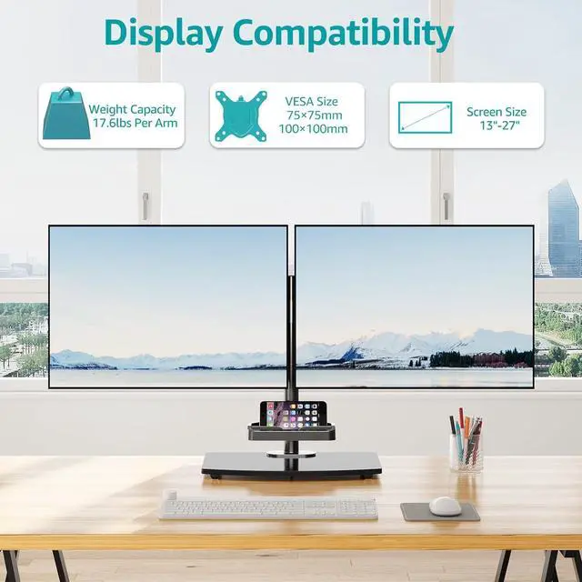 Sturdy Dual Monitor Stand: Our monitor mount fits two 13 to 27 inch screen monitors, and supports weight up to 17.6 lbs per arm, compatible with VESA patterns 75x75mm or 100x100mm. The free-standing tempered glass base is 15.7 x 11. You can also use the grommet base (suitable for desk thickness from 0.39 " to 3.15 " ). The hole diameter should be 0.39 " to 2.36 ".