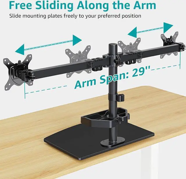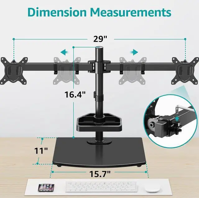 Adjustable Dual Monitor Arm: Our monitor stand allows your monitor to shift side-to-side along the 29" arm. The arms can move up and down along the 16 height pole. This double monitor mount offers -90° to +80° tilt, +90° to 0° swivel, 360° rotation. Monitors can be placed in portrait or landscape positions.