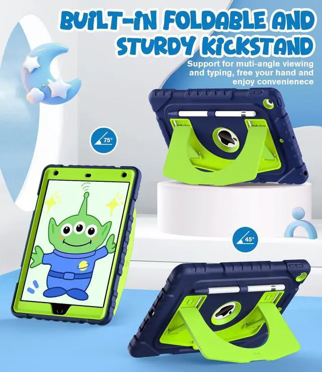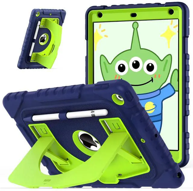 OKP Kids Case for iPad 9th/ 8th/ 7th Generation 10.2 Inch (2021/2020/2019), Heavy Duty 9 8 7 th Gen iPad Protective Cover with Built-in Kickstand, Pencil Holder for Kids Girls Boys, Navy Blue Green