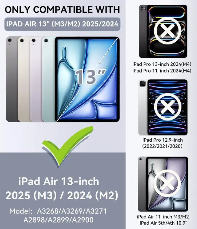 Compatible Model: The OKP protective case is only fit iPad Air 13-inch M3 2025 (A3268/A3269/A3271) and iPad Air 13-inch M2 2024 (A2898/A2899/A2900). Please check back bottom of your iPad to find the model number.Not fit with iPad Pro 13 inch & Air 11 inch