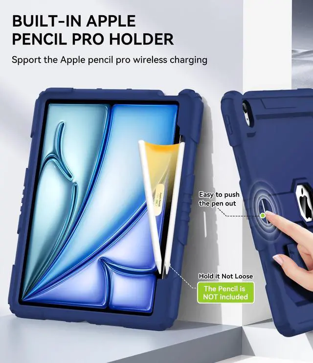 Built-in Pencil Holder: The OKP for iPad air 13-inch case is pair with Apple Pencil Pro/USB-C, which supports the Apple Pencil Pro wireless charging. But limited to the functionality of Apple Pencil USB-C itself, the case do not allows wirelss charging for it, only allows attaching itself to the side of case.Pencil is Not included