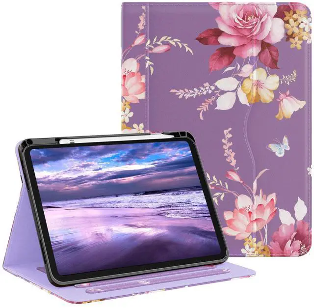 OKP Case for iPad A16 11th Generation 2025 / 10th Gen Case 2022, for 11 Inch / 10.9 Inch iPad Multi-Angle Viewing PU Leather Stand Cover with Pencil Holder & Pocket, Auto Sleep/Wake, PurpleFlower