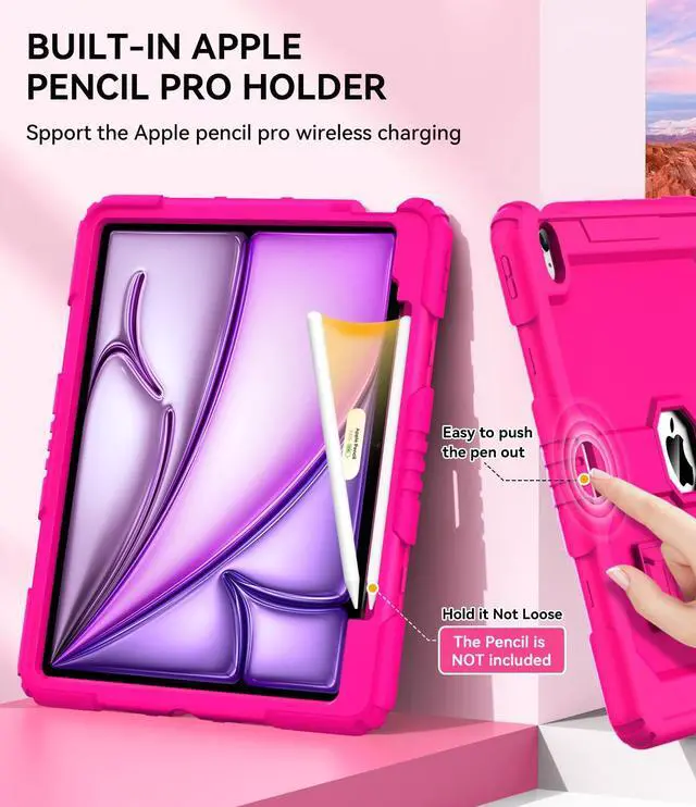 Built-in Pencil Holder: The OKP for iPad air 13-inch case is pair with Apple Pencil Pro/USB-C, which supports the Apple Pencil Pro wireless charging. But limited to the functionality of Apple Pencil USB-C itself, the case do not allows wirelss charging for it, only allows attaching itself to the side of case.Pencil is Not included