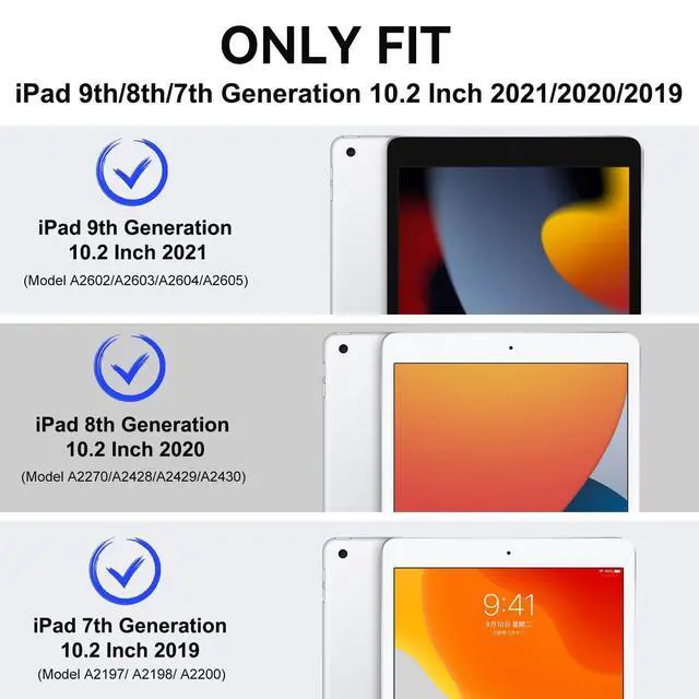 Compatibility: Only compatible with 10.2 iPad 9th generation 2021 Release (A2602 A2603 A2604 A2605); 10.2 iPad 8th Generation 2020 Release (A2270 A2428 A2429 A2430); 10.2 iPad 7th Generation 2019 Release (A2197 A2198 A2200). DO NOT fit for any other iPad.