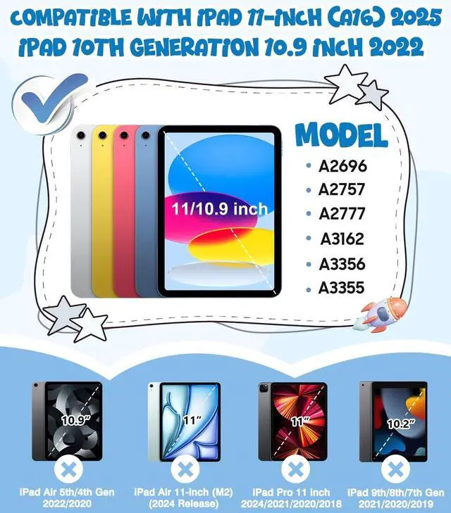 Perfect Compatibility: The OKP kids protective case is fit iPad 11 inch (A16) 2025 release (A3356, A3355, A3354) and iPad 10th generation 2022 released 10.9 '' (A14 Bionic) ( A2696, A2757, A2777, A3162); Not compatible with any other devices; Please check back bottom of your iPad to find the model number ^^