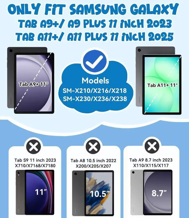 Compatible Model: The OKP 11 inch kids tablet case is fit New Samsung Galaxy Tab A9+/ A9 Plus 2023 (SM-X210/X216/X218) and Samsung Galaxy Tab A11+ Plus 2025 (SM-X230/X236/X238). Not compatible with any other devices ^^