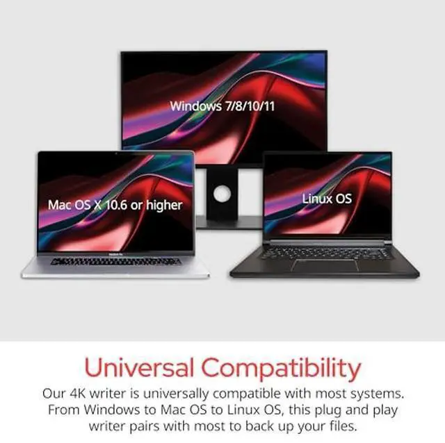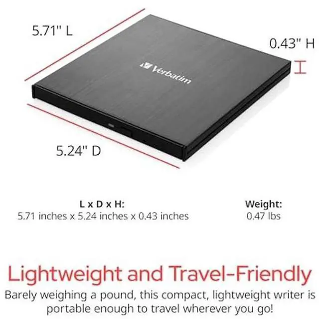Slimline Blu-ray writer with 4K Ultra HD Blu-ray playback; playback software not included. Must be purchased or downloaded separately. USB 3.2 GEN 1 with USB-C connection; 6x maximum write 4x maximum read speeds for BD-R/BD-R DL Compact and lightweight, ideally suited for use with a notebook or ultrabook; power provided by the USB port - no need to carry a bulky power adapter Includes award-winning BD/DVD/CD burning software Stores up to 100GB on a BDXL Disc 8.5GB on a Double Layer DVD 4.7GB on a standard DVD; fully compliant with MDISC archiving technology Includes a FREE 25GB Verbatim Blu-ray disc