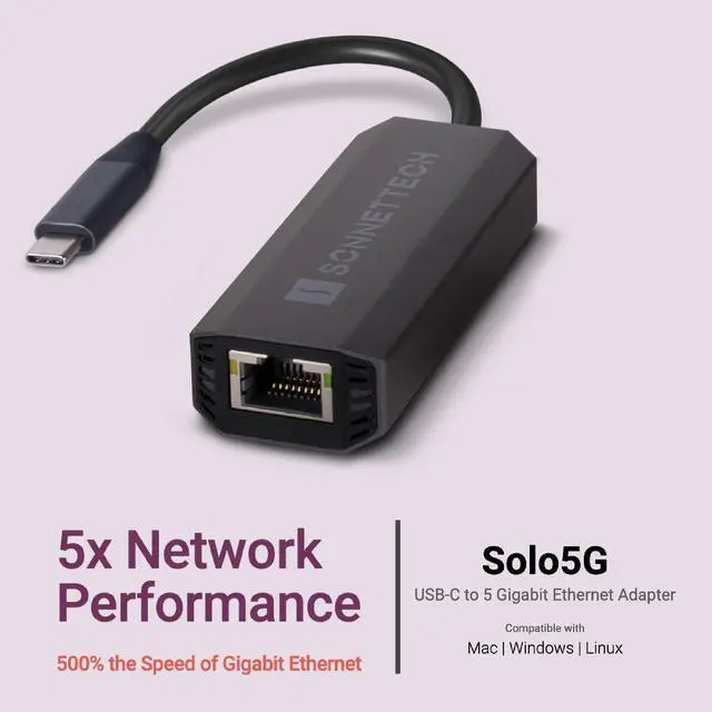 Sonnet Solo5G USB-C to 5 Gigabit Ethernet Adapter - RJ45 Supports 5Gbs, 2.5Gbps, 1Gbps, and 100Mbps, Plug-and-Play. Compatible with USB-C or Thunderbolt Port, Mac, Windows, and Linux