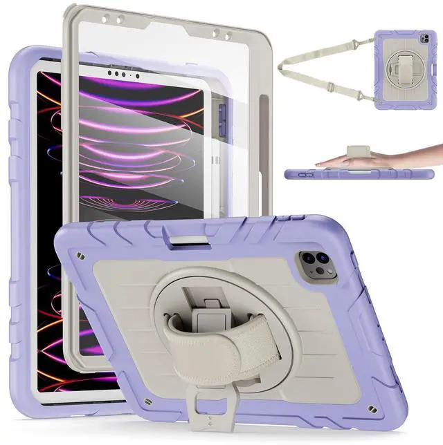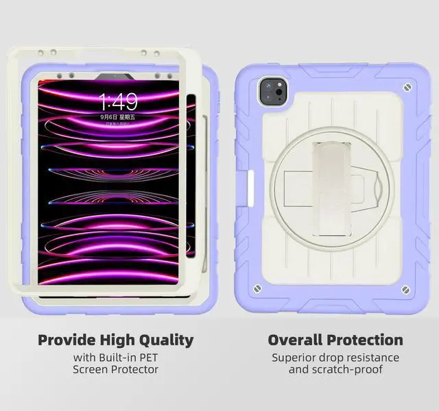 Stweap iPad Pro 11 inch Case 4th/3rd/2nd/1st Gen 2022/2021/2020/2018, Heavy-Duty Rotating Stand Protective Cover + Pencil Holder, with Hand Strap/Shoulder Straps Case for iPad Pro 11-inch, Purple+White