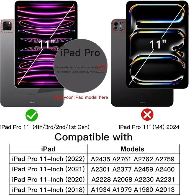 iPad Pro 11 inch Case: Compatible with Apple iPad Pro 11 inch 4th Generation 2022 Release (Model: A2759/A2435/A2761/A2762); 3rd Generation 2021 Release (Model: A2377 A2459 A2301 A2460); iPad Pro 11 inch 2nd Generation 2020 Release (Model: A2228/A2068/A2230/A2231); iPad Pro 11 inch 1st Generation 2018 Release (Model: A1980/A2013/A1934/A1979)