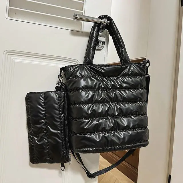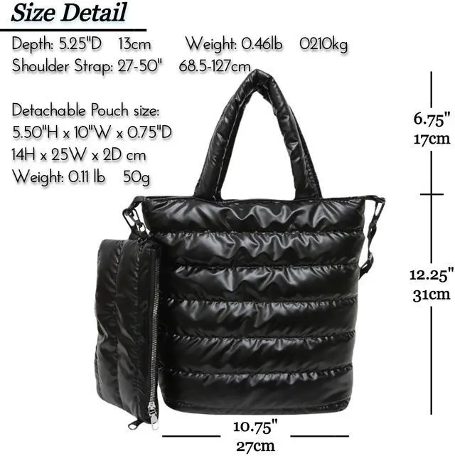 Quilted Metallic Lightweight Crossbody North South Tote Detachable Small Pouch, Puffer Bag Adjustable Strap, Shoulder Bag (Black)