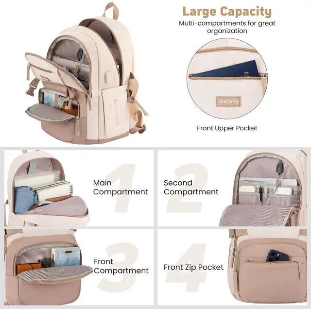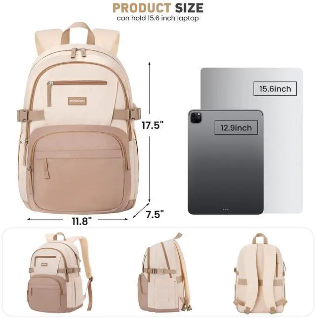 WINDARS Backpack for School Girls, Cute High School Backpacks for Teens Women Student Large Bookbag 15.6 Inch Laptop Bag with USB Charger Port for College Work Travel Trip (Khaki Beige)