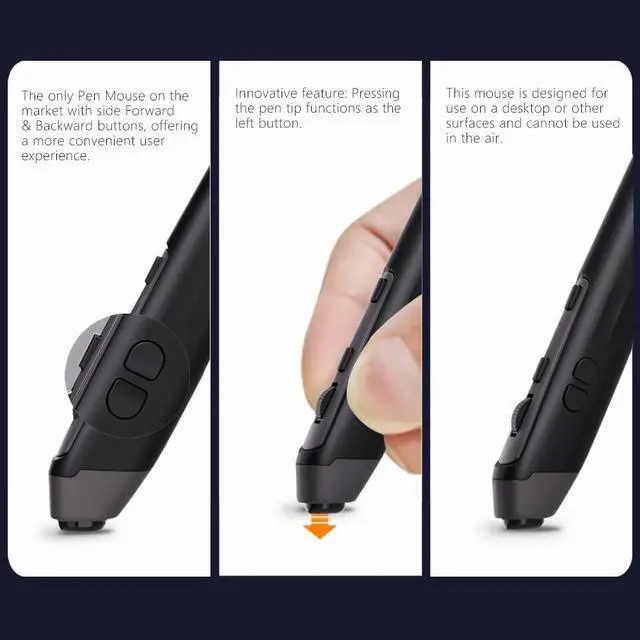Healthy Ergonomic pen-like shape Pen MouseDesigned in an ergonomic pen-like shape, the Computer Mouse Pen is perfect for small desks. Combining mouse precision with the familiar pen form, it offers users a comfortable and efficient input solution, ideal for limited desk space. ^^ Enhanced Clip Design and Receiver Storage The clip design improves the convenience of carrying it in your pocket, while the built-in receiver storage makes it more portable and travel-friendly, reducing the hassle of packing during trips or business travel. ^^ Added Forward/Backward Buttons Compared to regular pen mice, Plima Pen Mouse 2.0 features added forward and backward buttons, making web browsing more convenient and efficient.