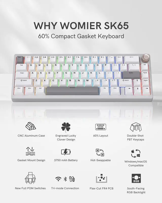 Gasket Mount & Sound AbsorbingFoams- SK65 mechanical keyboard takes the typing experience to a new level. Coupled with a gasket mount, multi-layer sound absorbing foam, and single key slotting flex-cut PCB plate, making the keyboard flex to reduce typing fatigue. We use thick PBT keycaps, oil resistant and wear resistant. Plus our Womier custom linear switches gives a very confident bottoming-out clack to each keystroke, with zero echo or reverberation due to their factory-lubed POM base. Widely applied in gaming or office