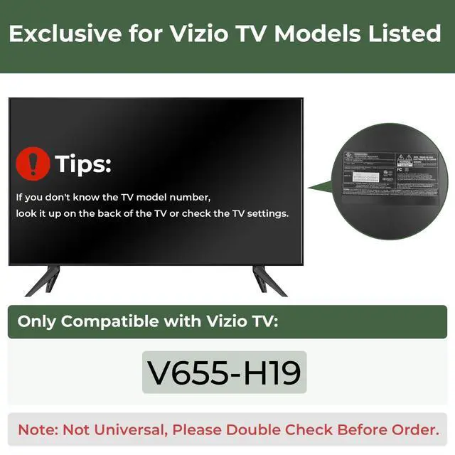 How to Confirm Your Model--See Picture 2. Check the back of your TV to make sure it matches. Not for other models. ^^ Compatibility List--TV stand only for Vizio TV replacement stand V655-H19. Not universal and not for other any TV sizes or brands. ^^ Durable ABS Material--Made of durable ABS plastic, these legs for vizio replacement TV legs provide stable support while staying lightweight. ABS resists cracking and damage, ensuring long-lasting use. Theyre easy to handle but tough enough to hold your TV securely without adding extra weight. ^^ Fast, Tool-Free Installation-- Installing these legs takes just minutesno extra tools or expertise needed.