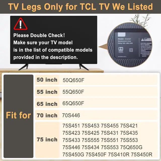 Non-universal Metal Base Stand for TCL TV Stand Legs ReplacementPlease Note: The TV legs is not universal! The TV Legs is only compatible with TCL we listed. Please check your TV model before purchasing. If your TV model is not listed below, this TV leg is not compatible with your TV.