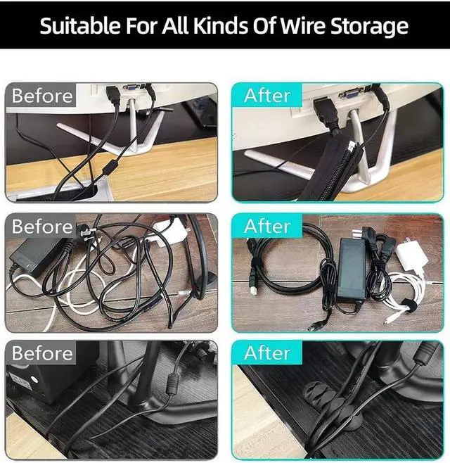 Flexible and versatile: Includes 10 pieces and 2 rolls of self-adhesive ties. Each tie is 6 in. long and 0.5 in. wide. An eyelet at the end allows the tie to be tied to the cable or hung on a hook. Multiple wire organizers can be connected together to form a longer tie.