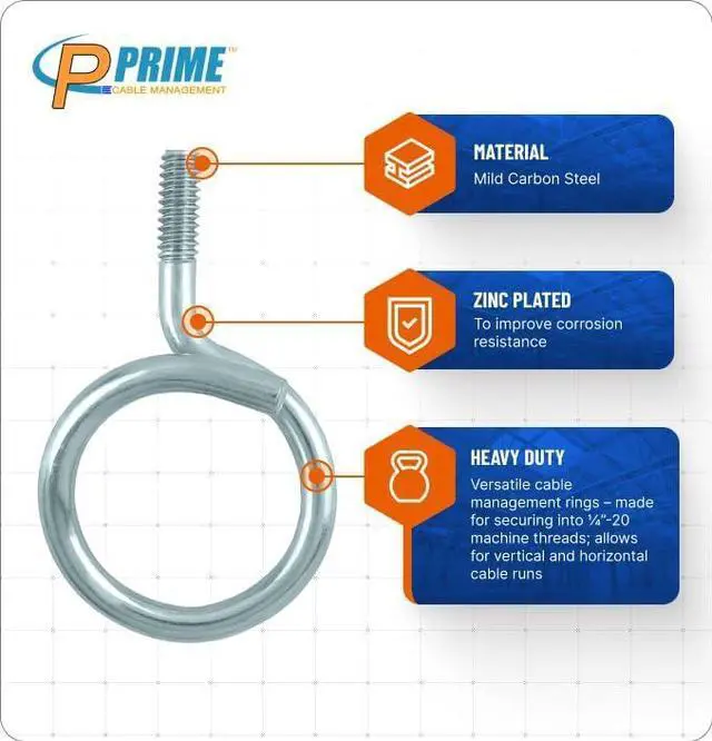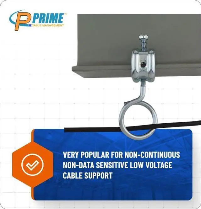 Very popular for non-continuous non-data sensitive low voltage cable support. Allows for easy installation, access and upgrade of existing cable runs without the use of conduit or trays. Package contains 100 x ¼-20 - 1 1/4 inch diameter bridle rings.