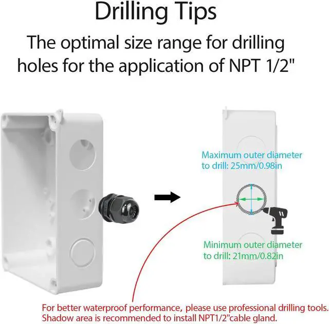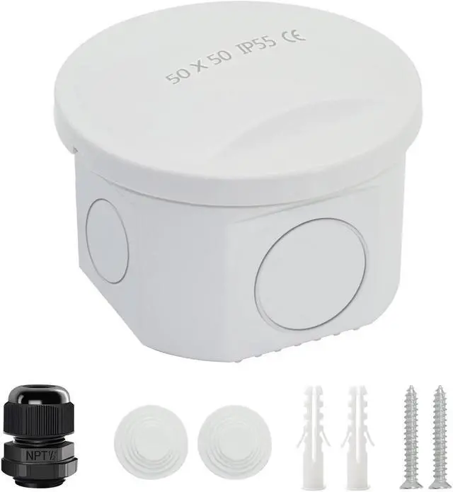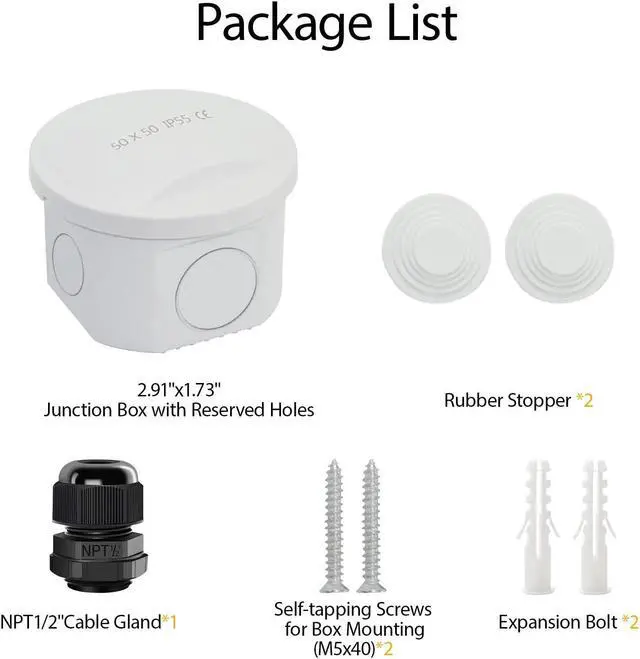 [ Package Content ] 1x Junction Box; 4x Stainless Steel Screws (M3*15); 2x Rubber Stopper; 2x NPT1"Cable Gland; 4x Self-tapping Screws for Box Mounting (M5*40); 4x Expansion Bolt.
