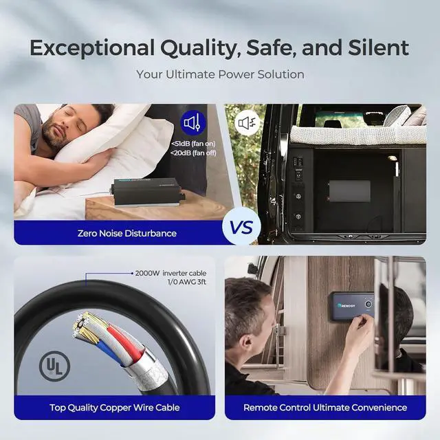 Quiet operationEnjoy quiet operation with power supply, boasting a noise level of less than 51dB, With the help of a silent 12V inverter, all electronic devices run smoothly without any noise interrupting the peaceful ambiance.
