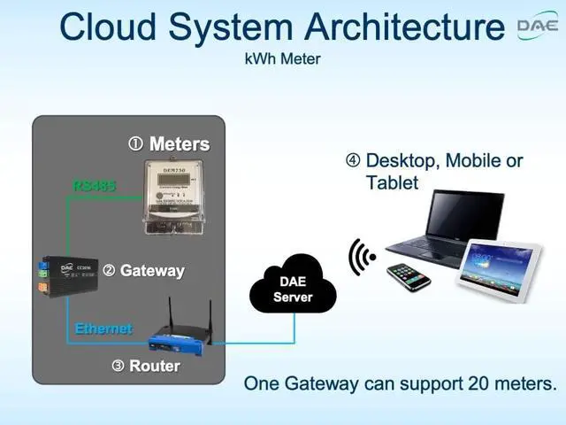 DAE CC2030 Gateway will collect the kWh data and send them to the cloud through Ethernet. With cell phone, PC, you will be able to get access to real time data as well as the monthly kWh consumption and billing reports to their tenants.
