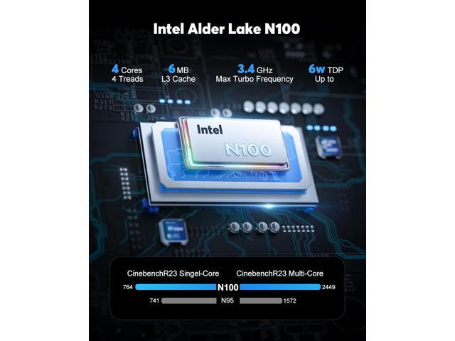 - 12th Alder Lake N100 CPUNewest 12th Alder Lake N100 (Up to 3.4GHz, 4 Cores/4 Threads, 6M Smart Cache, 6W TDP) compared with (N95/N5105/N5100/N5095), our mini pc N100 cpu more powerful performance and smoother running.