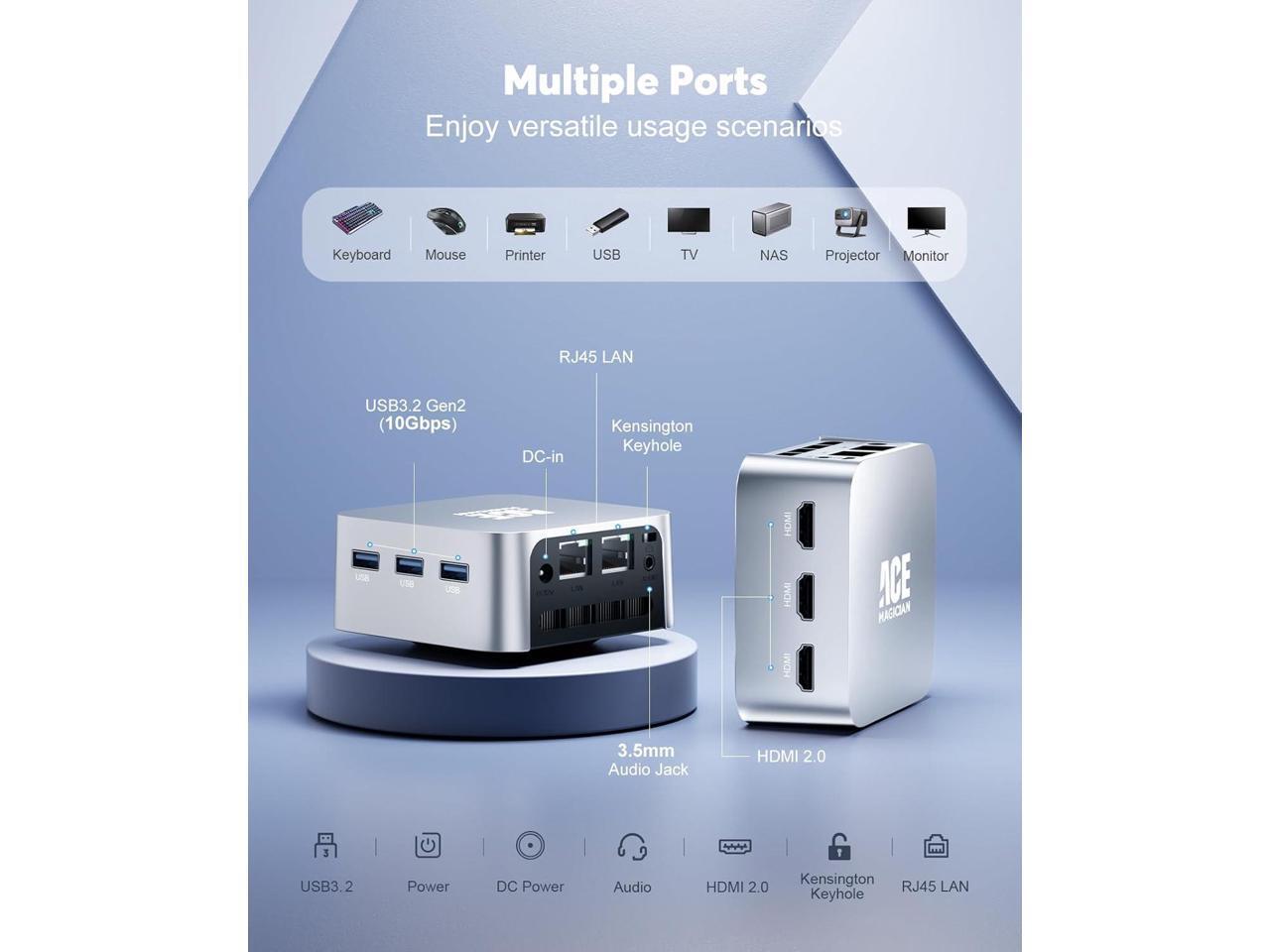 - 12GB LPDDR5 256GB SSDThe mini computers adopt the latest LPDDR5 with a frequency of 3200MHZ,which is 72% higher than DDR4, the power consumption is reducedby 25%, and the powerful running speed can ensure that multipleapplications can be browsed at the same time without freezing.