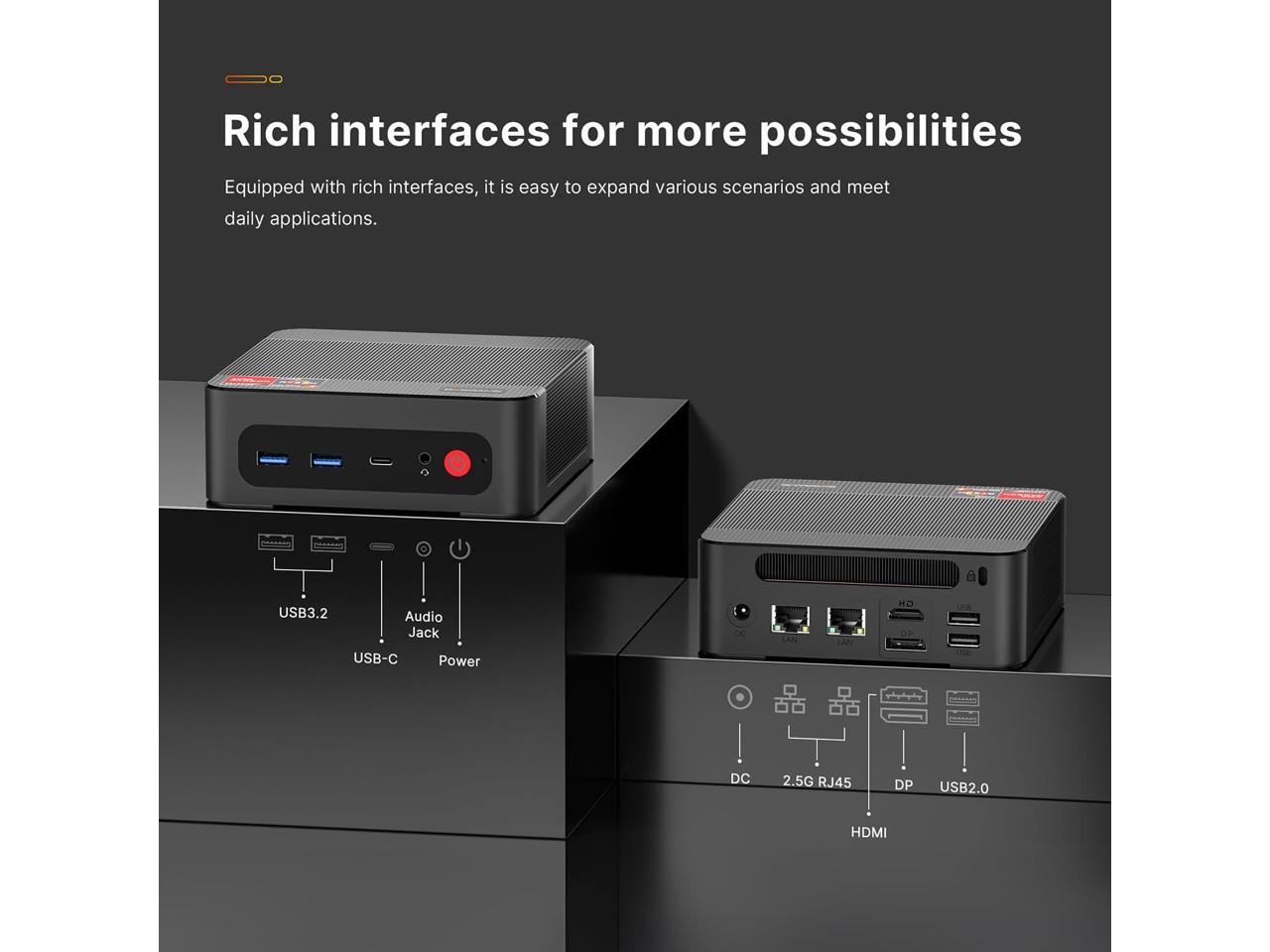 DUAL CHANNEL 32GB RAM 1TB SSDP4 Pro mini pc is equipped with high-speed dual channel 32GB (2x16) DDR4 and 512GB SSD, which allows the small PC to run several high performance operations simultaneously. If you want more storage space, you can also add a 2.5" SSD (no included) to expand the memory upgrade storage to 2TB to suit your needs.
