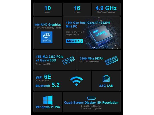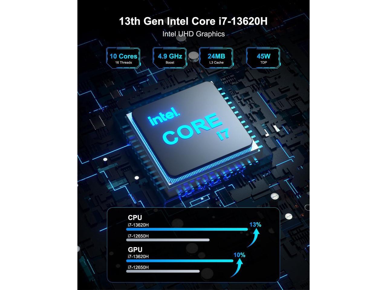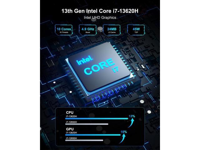 - 13th Gen i7 Mini Desktop PC - GEEKOM Mini IT13 i7 Mini Computer is powered by the Newest 13th Gen Core i7-13620H (10C/16T, 24M Cache, up to 4.9GHz). It runs faster than R9-6900HX, R7-7735HS, i7-12650H and i5-13500H processors. NUC 13 mini PC has only 90W of power yet delivers the same powerful performance as a tower desktop PC. It is designed for a variety of solutions such as education, home office, media center, HTPC, digital signage, and so on.