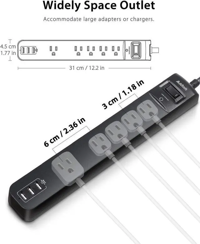 15Ft Upgrded Extension Cord & Wall Mountable - The 15ft-long extension cord is made of 14AWG pure copper, which is very thick and has better current carrying capacity (15A). The braided power cord is not easy to deform, durbale and more safety than other power cord. The 45°flat plug will not block the bottom receptacle of your duplex wall outlet. Two holes on back allow you install the power strip on wall, workshop, make your table clean