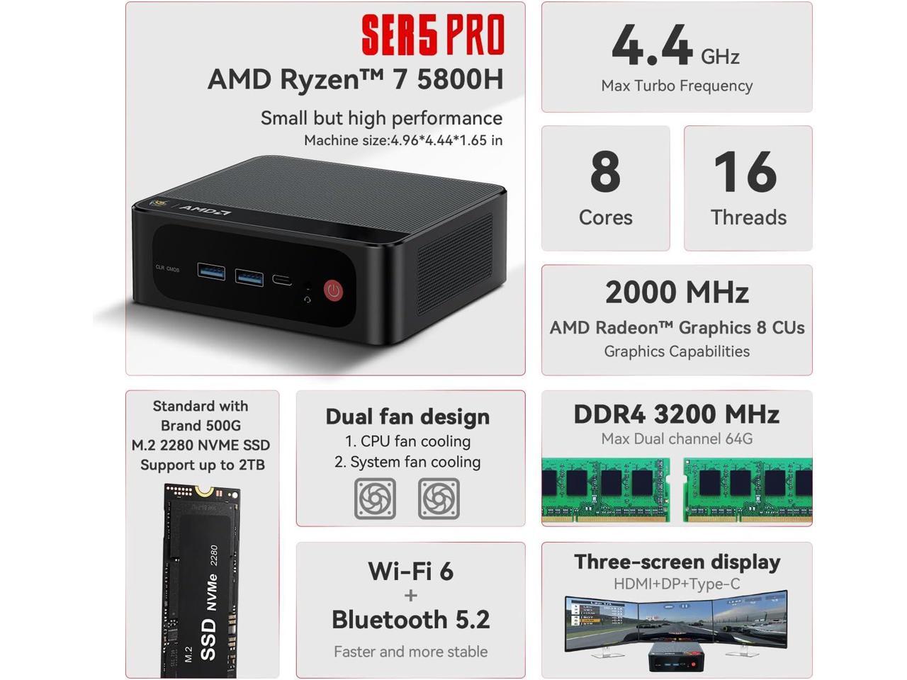 SER5 Mini PC, Ryzen 7 5800H PRO(8C/16T,up to 4.4GHz),Mini Computer with 16GB DDR4 RAM/500GB M.2 2280 SSD,Micro PC Support 4K FPS,WiFi6/BT5.2/USB3.2/Home/Office/Game