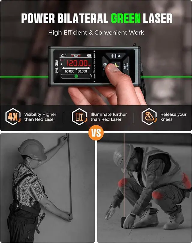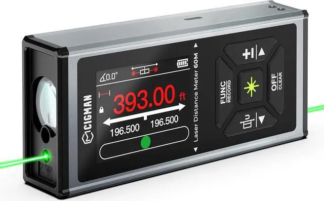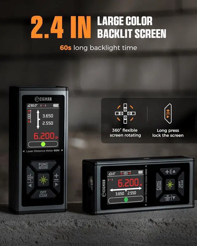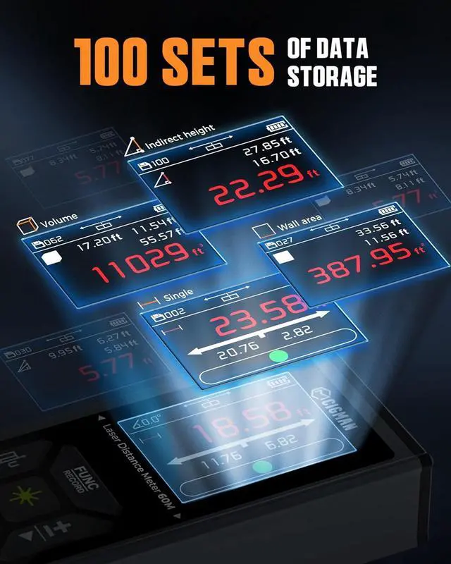 60s LONG BACKLIGHT & Data Record: Our laser measurement tool comes with a spacious 2.4 -inch color display and data recording capability. The screen stays clear under bright light for up to 60 seconds with its high-definition display. With storage for up to 100 sets of data, you can conveniently save measurements for later use, simplifying your tasks
