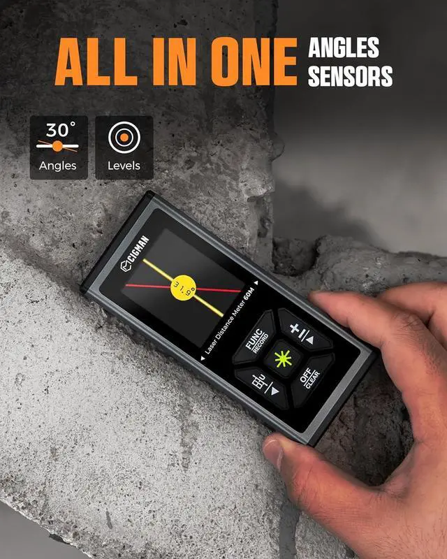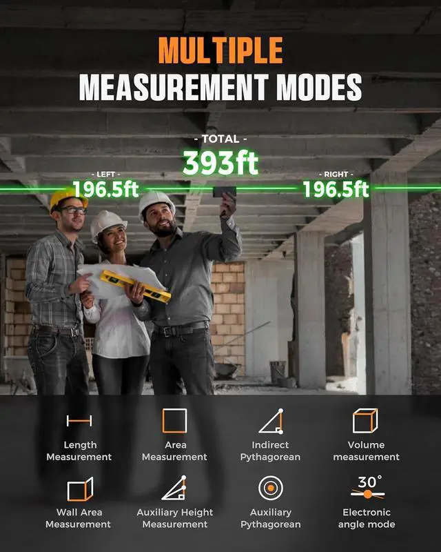 MULTIPLE MEASUREMENT MODES: Our dual distance meter provides 11 measurement modes such as length/area/volume/angle/wall/indirect pythagorean/auxilliary pythagorean to meet your various measurement needs in different scenarios. Switchable among M/In/Ft for free adjustment
