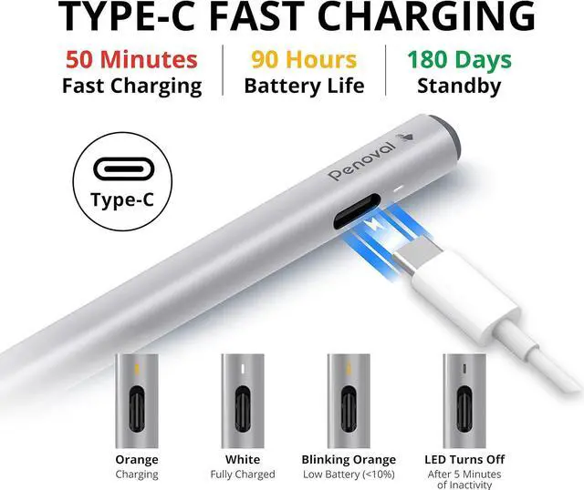 TYPE-C FAST CHARGING & ALUMINUM ALLOY - Compared to the previous version of USI, this recharging model makes it more environmentally friendly & reusable. Up to 90 hours of usage time when you charge it for 50 mins. The stylus pen is made of aluminum alloy, making it sturdy and long-lasting.