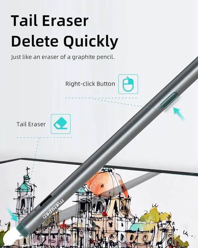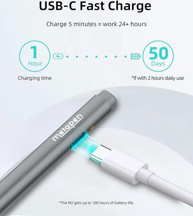 Advanced Conelike Tip & Premium Feel: Differ from the old-fashioned styluses with tubular tips, Metapen M2 enjoys a cone tip for a strong signal and a more streamlined design on the whole. Besides, an aluminum-alloy body with a round corner square shape makes it more pleasant to grip and more likely to stay put on the desk