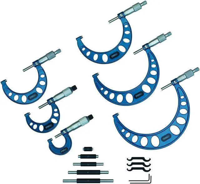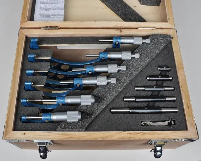 ACCURATE MEASUREMENTS: 0.256" diameter of measuring faces, 0.00003" flatness, and 0.00005" parallelism on 0 to 1" micrometers SET INCLUDES: Six micormeters, adjustment wrenches, and wooden fitted case