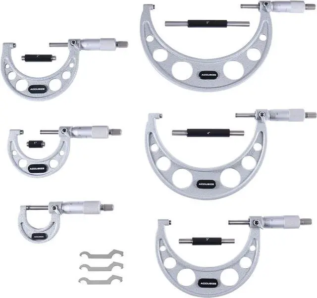 • Includes 6 micrometers with Measuring Ranges: 0 - 1'', 1 - 2'', 2 - 3'', 3 - 4'', 4 - 5'', and 5 - 6'', Vernier Graduations: 0.0001'', accurate to 0.0001''. Mitutoyo style frame - solid casting frame.