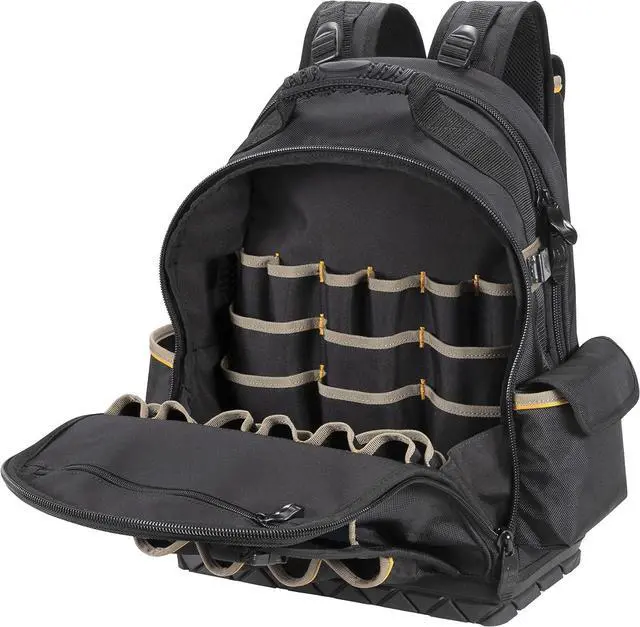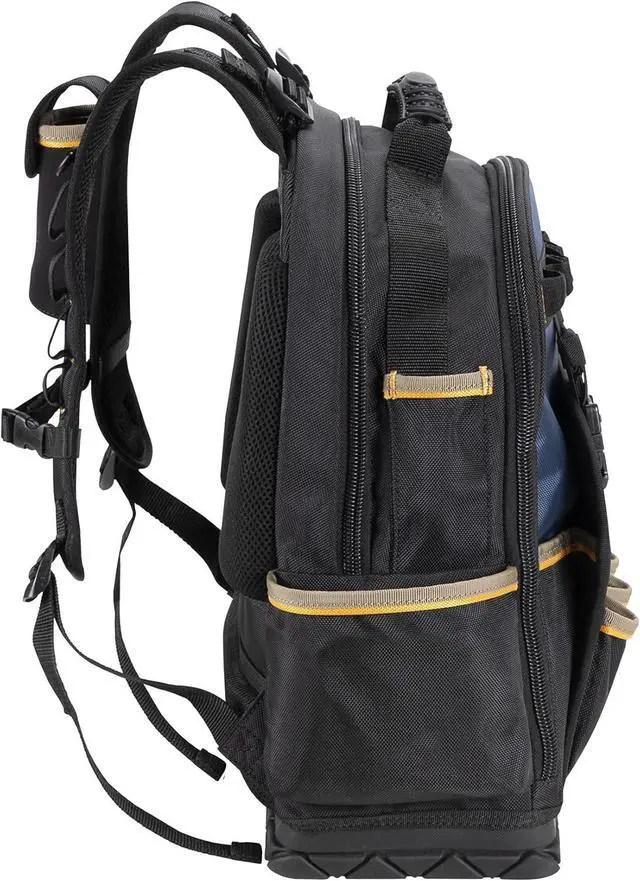 ERGONOMIC TOOL BACKPACK: This tool backpack has webbing and ergonomic silicone rubber on the carrying handle to help support heavy loads. It also features heavy zippers and large, ergonomic metal zipper pullers.