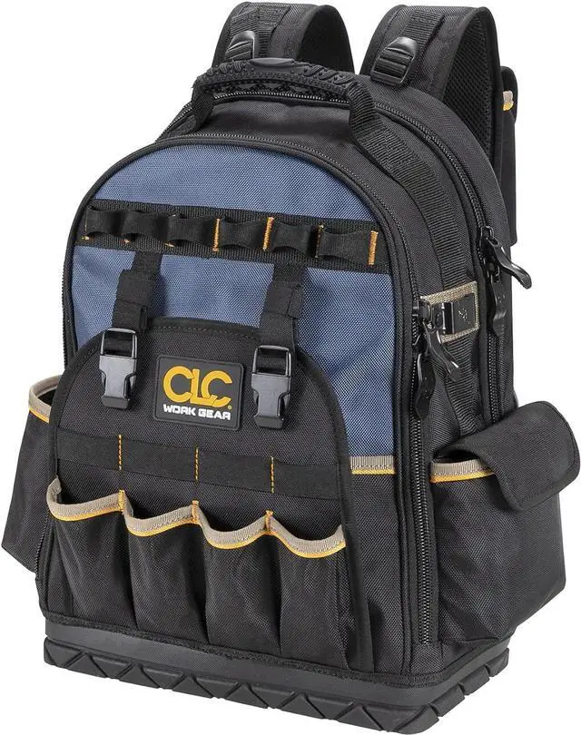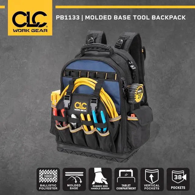 Tool carrying just got easier with CLC's Molded Base Tool Backpack. Durably designed to handle more wear and tear, this backpack is configured with a tough molded base, 1680D Ballistic Polyester material and ample space to organize your jobsite tools. The flat surface of the base allows the backpack to stand upright on the ground to keep tools dry and consists of a softer material with 3 large foam backpads for extra carrying comfort. It features 2 large zippered compartments with 38 reinforced pockets, an ergonomic silicone rubber carrying handle to support heavy loads, adjustable padded shoulder straps with slip resistant material, cell phone holder and 2-way adjustable sternum strap. Not only is there enough tool space, but this backpack also has a padded compartment to store necessary electronics such as a laptop or tablet and keep valuables safe. The heavy-duty quality and multi-functional compartments of the CLC Molded Base Tool Backpack make it well-suited for trade professionals.