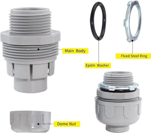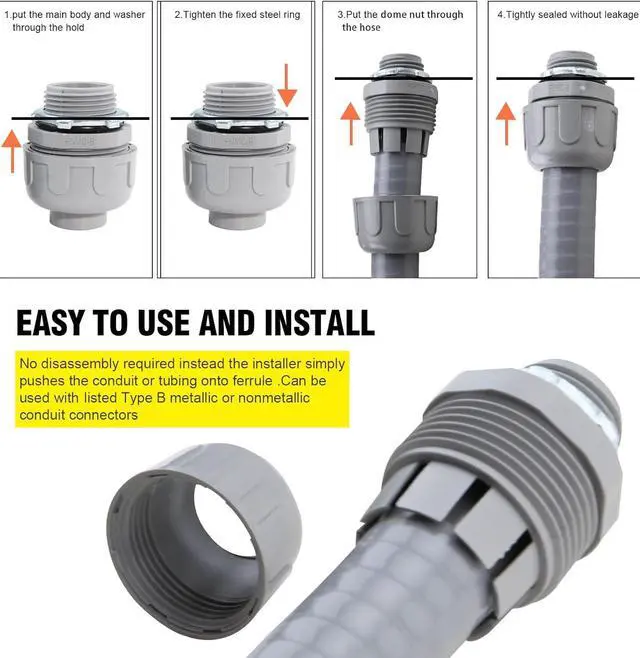 EFFORTLESS LNSTALLATION-The Liquid-Tight Conduit Connector Fits is fast, NO disassembly is required and only one person can complete you can simply tighten the dome sealing nut by pushing the conduit or pipe onto the ferrule.