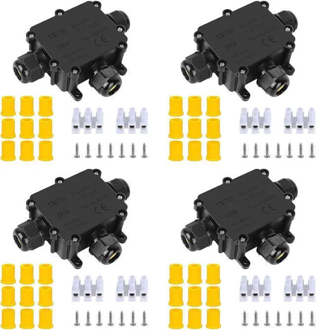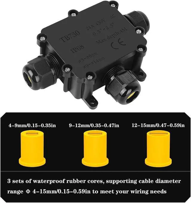 Dimensions: 102 * 67 MM IP68 waterproof junction box Electrical cable connector 2 pin / 3 pin / 4 pin M20T connector cable range 5 to 12 mm outer cable outer sleeve coupling 1 pc. Rubber ring and clamping nut to provide the perfect waterproof, airtight sealing, safety for interior and garden. Easy to install, just unscrew the ends of waterproof connector and connect the corresponding line.