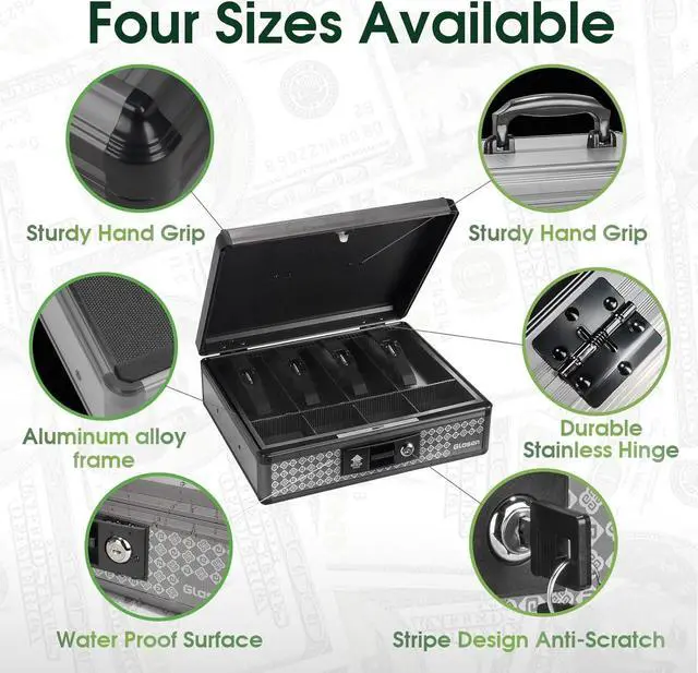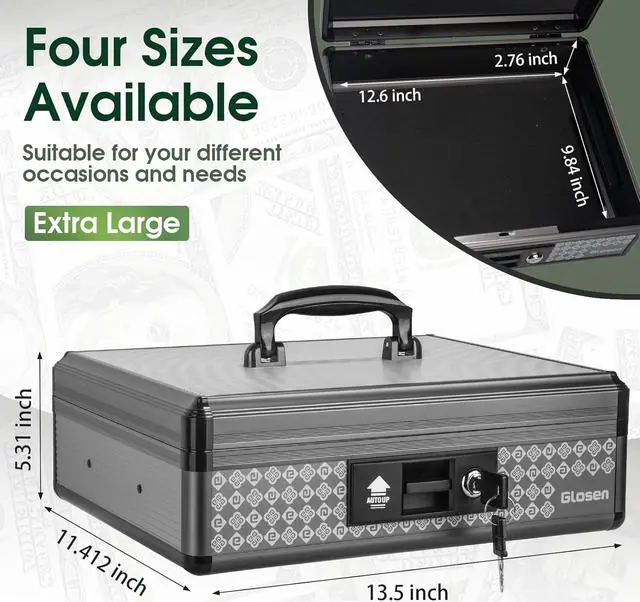 SIZE & COLOR: The Glosen cash box comes in four sizes for you to choose from. Classic black color appearance is understated and elegant, never out of fashion, perfect lock box for corporate/personal use.