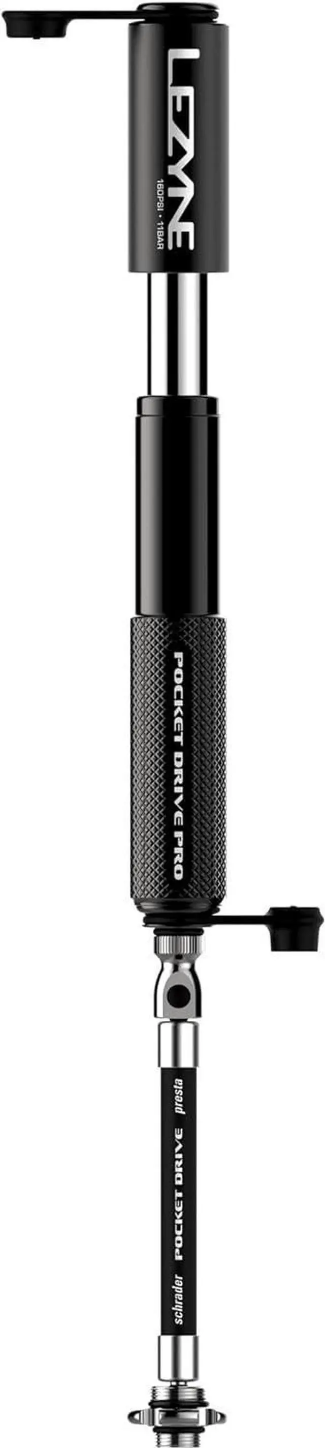 "The Pocket Drive is an amazingly compact and lightweight bicycle hand pump with plenty of pumping power. It is made from durable CNC machined aluminium and has a handle that is slightly knurled for non-slip operation. With its overlapping handle and integrated ABS flex hose, the Pocket Drive offers performance unmatched for its size. The pump is compatible with Presta and Schrader valves and can be fully converted for further use at a high level. Lezyne Mini Pump Pocket Drive Pro -